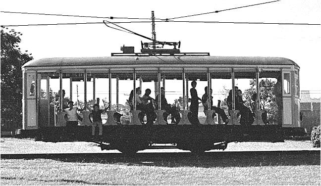 In the 1930s Campinas trams were renumbered in the 100s and remodeled: clerestories and bulkheads were removed, vestibules were enclosed, bodies were lengthened and the 6+4 bench arrangement was replaced by 9 single benches. Here is former Campinas tram 125 (ex-25) operating as number 4 in Portugal Park in April 1981. (It still runs there today.) [Allen Morrison]: