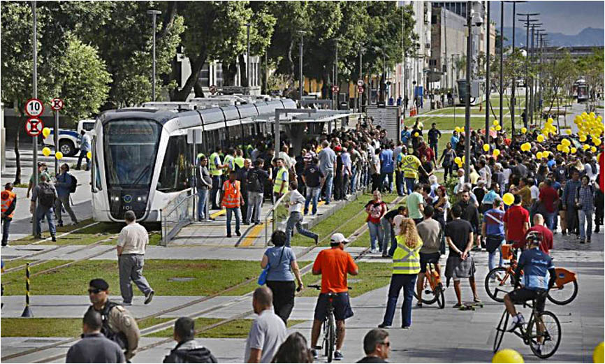 [*Term used in Projeto Básico Pré-Metrô published by the Companhia do Metropolitano do Rio de Janeiro in 1977. The term "veículo leve sobre trilhos" was not found anywhere in the book – or in newspaper reports of the 1980s. It seems first to have been used in the 1990s in Campinas.] Both those lines were built along the paths of former railroads – the E.F. Rio d'Ouro in Rio and the E.F. Sorocabana in Campinas. Rio's new light rail system is completely new and original and, for the most part, runs on paved streets – including on the city's prestigious main street, Av. Rio Branco, where trams never ran before. After Rio was chosen in 2009 to host the August 2016 Olympic Games, it began an ambitious program of reconstruction and renovation of the central, downtown area. The new "Porto Maravilha" will have 70 km of new roads, sidewalks and bike lanes, 15,000 trees, renovated water, gas, electricity and telecom networks, two tunnels, a 3-station aerial cableway, and a 28 km system of modern tramway lines. English speakers use the term Light Rail. Brazilians say VLT – veículo leve sobre trilhos – for both the vehicle and the line [see map above]. In April 2013 the Prefeitura (municipal government) signed a contract with RATP of Paris and a consortium of Brazilian companies to build, operate and maintain the tramway system for 25 years. Cost was estimated (in 2013) at USD $380 million. Alstom was selected to build the first five of 32 cars in La Rochelle, France. It is building the remaining 27 at its new factory in Taubaté near São Paulo. Downtown Rio was dismantled. The Perimetral, the elevated highway along the bay, was leveled and replaced by a 4.8 km tunnel. A sea of railroad tracks was replaced by a paved road with tram tracks. The first project to be completed was the Teleférico da Providência (aerial cableway) which began commercial operation on 2 July 2014 [see map above]. The view below is south. The tower on the right marks the train station. The hill in the distance is Santa Teresa [Rio Prefeitura]: