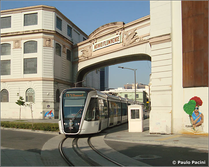 Av. Rodrigues Alves along the harbor [see map] was once lined with freight railroad tracks and an ugly elevated highway. The highway has been moved underground and the avenue is now a grassy mall with VLT tracks for Linha 1 [Alstom video]: