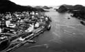 (01) Looking east over Vitória Bay, about 1950 [see map]. Vitória is on the left, Vila Velha on the right, the Atlantic Ocean in the distance. [pc, col. AM] |