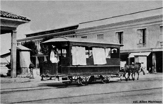 The Stephenson car above is similar to a model that J. G. Brill Co. of Philadelphia built in 1884 for Bogotá, and it is possible that Brill also supplied horsecars to Guayaquil. Brill order 951 of 11 January 1884 was for a tram of this type, 30 inch gauge, but the purchaser was not recorded. An 1890 inventory of Empresa de Carros Urbanos reported 1 open and 7 closed trams for use on vía angosta (narrow track), and 4 open and 10 double-deck cars for vía ancha (wide, standard gauge). Here is another picture of a Stephenson tram running in Guayaquil. [col. AM]