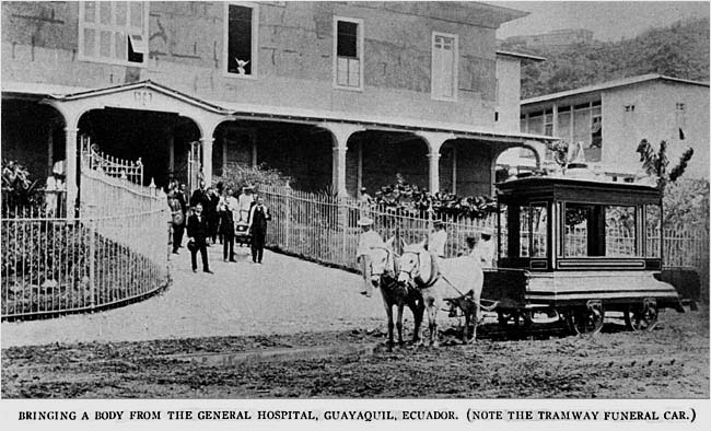 Ecuador's principal port and largest city (2000 population: 2 million) sprawls along the west bank of the Guayas River, about 20 miles from the Pacific Ocean [see area map]. At sea level and latitude 2° S, its climate is quite different from that of the country's capital, Quito, up in the mountains at 9,350 feet, but is tempered by the icy waters of the Humboldt Current. Guayaquil is the center of Ecuador's manufacturing and fishing industries. The Ferrocarril del Sur (later Guayaquil & Quito Railway) started construction in 1871 at Durán, on the other side of the Guayas River, and began carrying passengers to Milagro in 1874 [see area map]. The G&Q never crossed the river into Guayaquil. Another line, Ferrocarril a la Costa, ran west from Guayaquil to Salinas, but didn't begin operation until 1923. The first rail operation in Guayaquil was a horsecar line that Empresa del Salado opened along Av. 9 de Octubre, from Plaza Rocafuerte to a park on the Estero Salado, on 20 July 1873 [see city map]. Track gauge was 30 inches and the trams were built by John Stephenson Co. in New York [see Brown in BIBLIOGRAPHY]. Tramway development in the 1880s is unclear, but Empresa del Salado seems to have built a branch to the cemetery in 1882 [see map]. The Empresa de Carros Urbanos, founded on 20 November 1883, acquired the Salado lines and ordered an assortment of trams from John Stephenson in New York – both single- and double-deck, and for both 30 inch and 56 1/2 inch ("standard") gauge track. Here is one of its single-deck standard gauge cars – the same type as shown in the color view above. [postcard, col. AM]