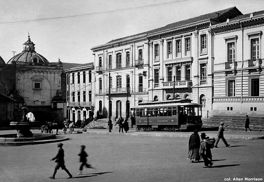 (06) Brill tram 50, also shown in picture 05, at Plaza de Santo Domingo in Quito [see map]. It will turn around the church on the left and descend Calle Maldonado. [pc, col. AM]