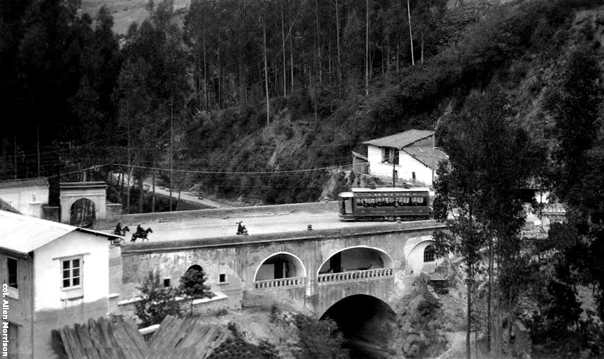 (12) A 4-axle car crossing another bridge on Calle Maldonado, over Río Machángara [see map]. Trolleybuses speed through here today. [pc, col. AM]