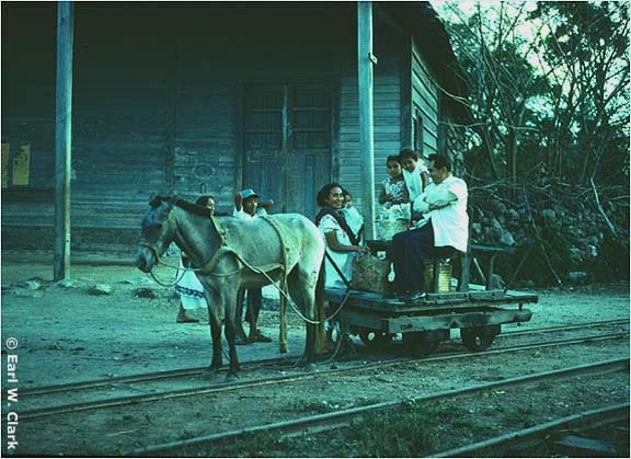 Another family uses Yucat‡n's free public transportation system near Motul [see map]. Date is 1962. There were not many passing places: when two plataformas met going in opposite directions, the driver with the lighter load lifted his vehicle off the rails so that the other could pass [Earl W. Clark]: