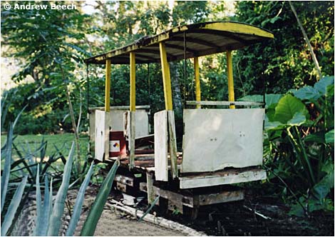 Thirty-seven years later, in 1999, Englishman Andrew Beech and his wife visited the Hacienda Temoz—n and found the vehicle below Ð which seems identical in every detail to the plataforma that the family above rode in 1962! Mr. Beech and his wife placed this car on 500 mm gauge track that they found on the hotel grounds and took a ride [Andrew Beech]:
