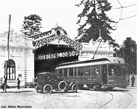Now that the Chorrillos tram line was part of the EEA system, its cars ran straight through the former TELC station at "Exposición" [see map]. The photo below shows one of the St. Louis cars originally owned by the CNTE and seen in the 5th photo above. (The TELC station can also be seen in the 4th photo above and in Part 1) [col. AM]: