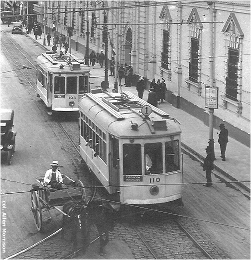 The construction of electric tram lines to Chorrillos and Callao [see Part 1] sparked interest in electric transport throughout the city. The Ferro-Carril Urbano prepared to electrify its horsecar system but was upstaged by a new group, Compañía de Automóviles de Lima, which purchased six battery-powered buses from J. G. Brill in August 1904. The self-propelled vehicles, which may have been the first of their kind in the world, were placed in service between Plaza de Armas and the Exposición in 1905 [see map]. But their motors were weak, the batteries burned out, and after two months Lima's rubber-tired trams were rebuilt to run on gasoline.