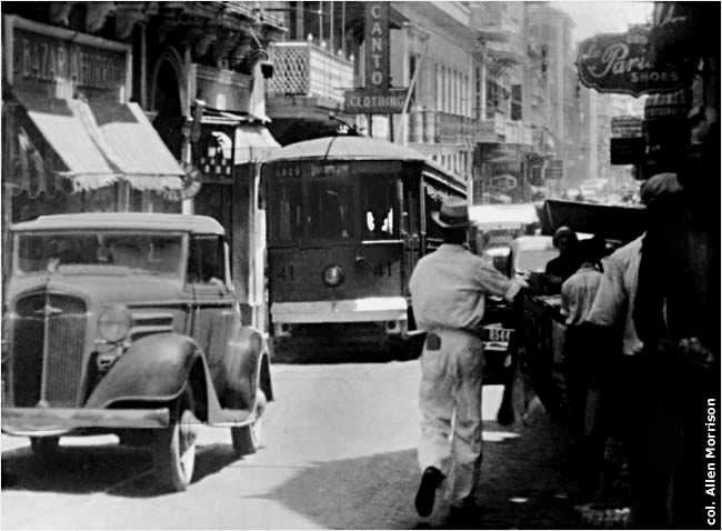 An inscription on the back of the picture below indicates that tram 41 was photographed on Calle Salvador Brau in Old San Juan in "1936 or 1939". That street is called Calle San Francisco today [see map]. The word "LAZO" (loop) in the car's destination window on the left means that the it is going to follow the big loop around Santurce; the barely legible words "vía Condado" in the middle window indicate that it will travel clockwise. The photographer did not write his name [col. AM]:
