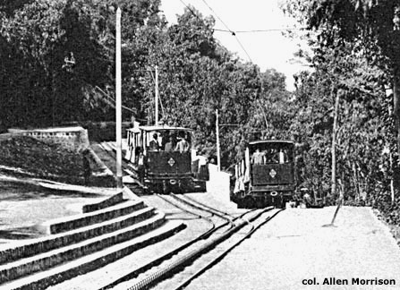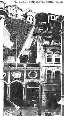 El primer ferrocarril funicular de América Latina fue sin lugar a dudas el Serra do Mar Incline, que comenzó a subir trenes por la montaña entre Santos y São Paulo en 1867. El primer funicular urbano, similar a un tranvía, fue el Plano Inclinado Gonçalves en Salvador, capital del estado de Bahía, Brasil, que abrió en 1874. La vista de esta tarjeta postal francesa es de aproximadamente el año 1900, antes de que la estructura fuese remodelada. Ferrocarriles de plano inclinado fueron después construidos en otras ciudades y muchos de ellos aún funcionan [col. AM]:
