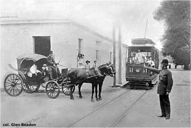 The date, location and circumstances of the view below are unknown. Unless it was renumbered, tram 51 was built about 1915. The scene may be posed, perhaps for a film or advertisement. There are two horses, but there are only five legs. Is the policeman telling the carriage and horses to back up? [col. Glen Beadon]: